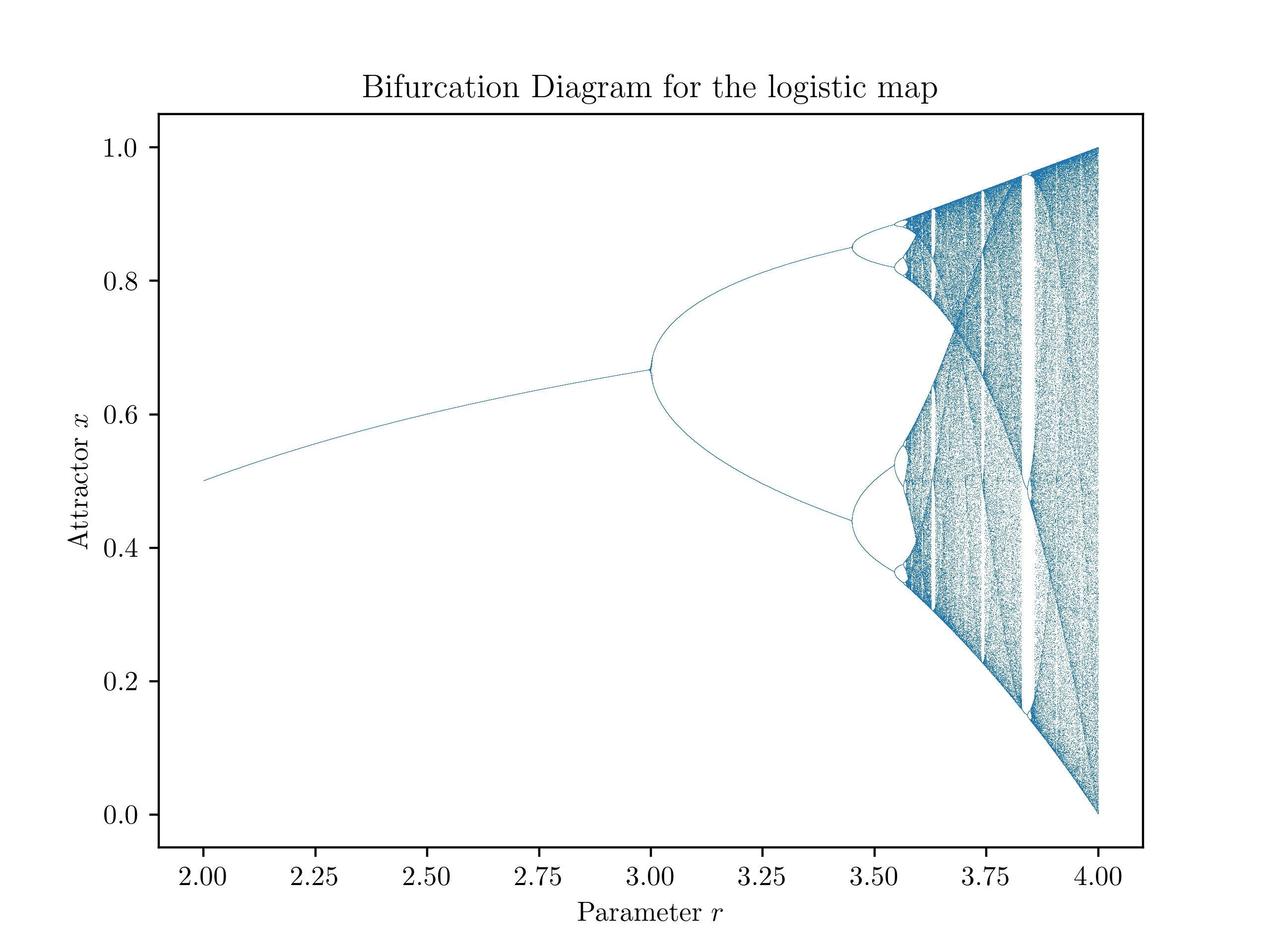 This type of diagram is also called bifurcation diagram, because one can clearly see these characteristic forking points (e.g. $r=3$) - bifurcations. It seems like there are some intervals for which there is complete choas and some other areas for which there is some kind of stability. There are so many more things which seem super interesting. You might want to read the Wikipedia-Article about the logisitic map. I am still looking for some clarification on how to more or less mearsure the chaotic behavior.