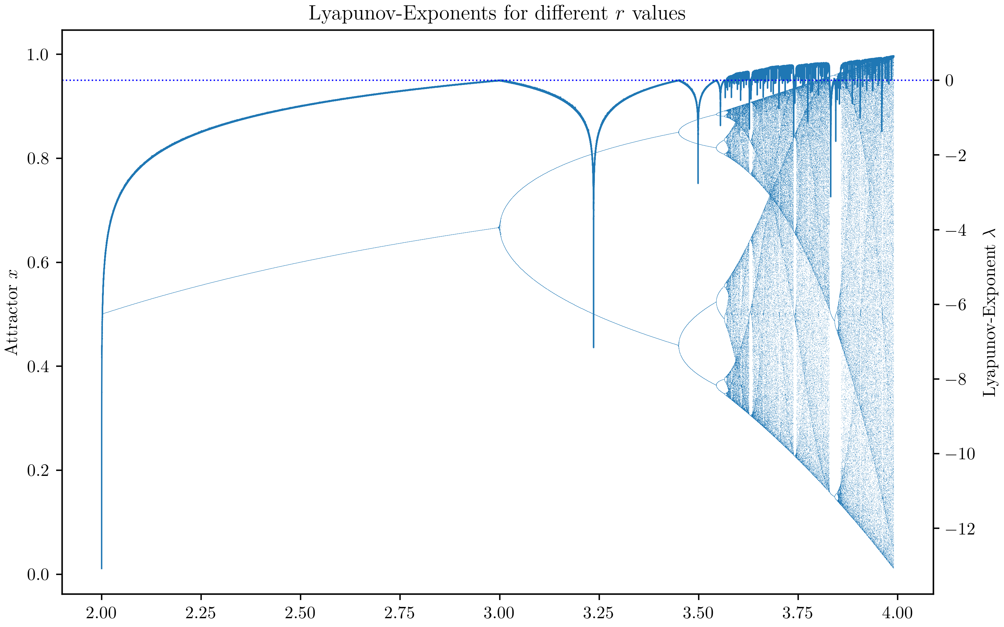 One can see how the value of $\lambda$ is bigger than $0$ in the regions of chaos and how it’s dropping below $0$ in the intervals of stability. By examining the Lyapunov exponents in the diagram, we can gain a deeper understanding of the logistic maps behavior and the range of dynamics it can exhibit. This information contributes to our understanding of nonlinear systems and their sensitivity to initial conditions.