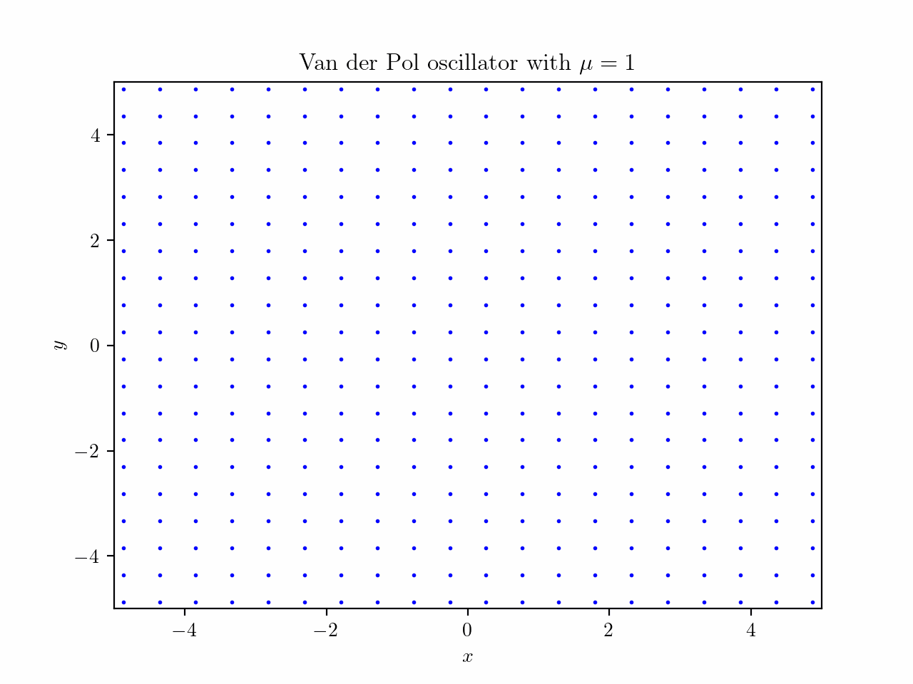 where $\mu$ is just a scalar value, which can be chosen arbitrarily. We will plot $x$ on the horizontal axis and $y$ on the vertical axis. This system is named after the Dutch electrical engineer Van der Pol, who was working with a simplified version of vacuum tubes in electrical circuits. I just want to look at the interesting behavior of this system to explore the usage of phase spaces (I basically saw this interesting image on Wikipedia, which shows a limit cycle). To illustrate this, consider a grid of many starting points - basically representing different starting conditions - then we start the time for all of these systems at once. This is what happens: